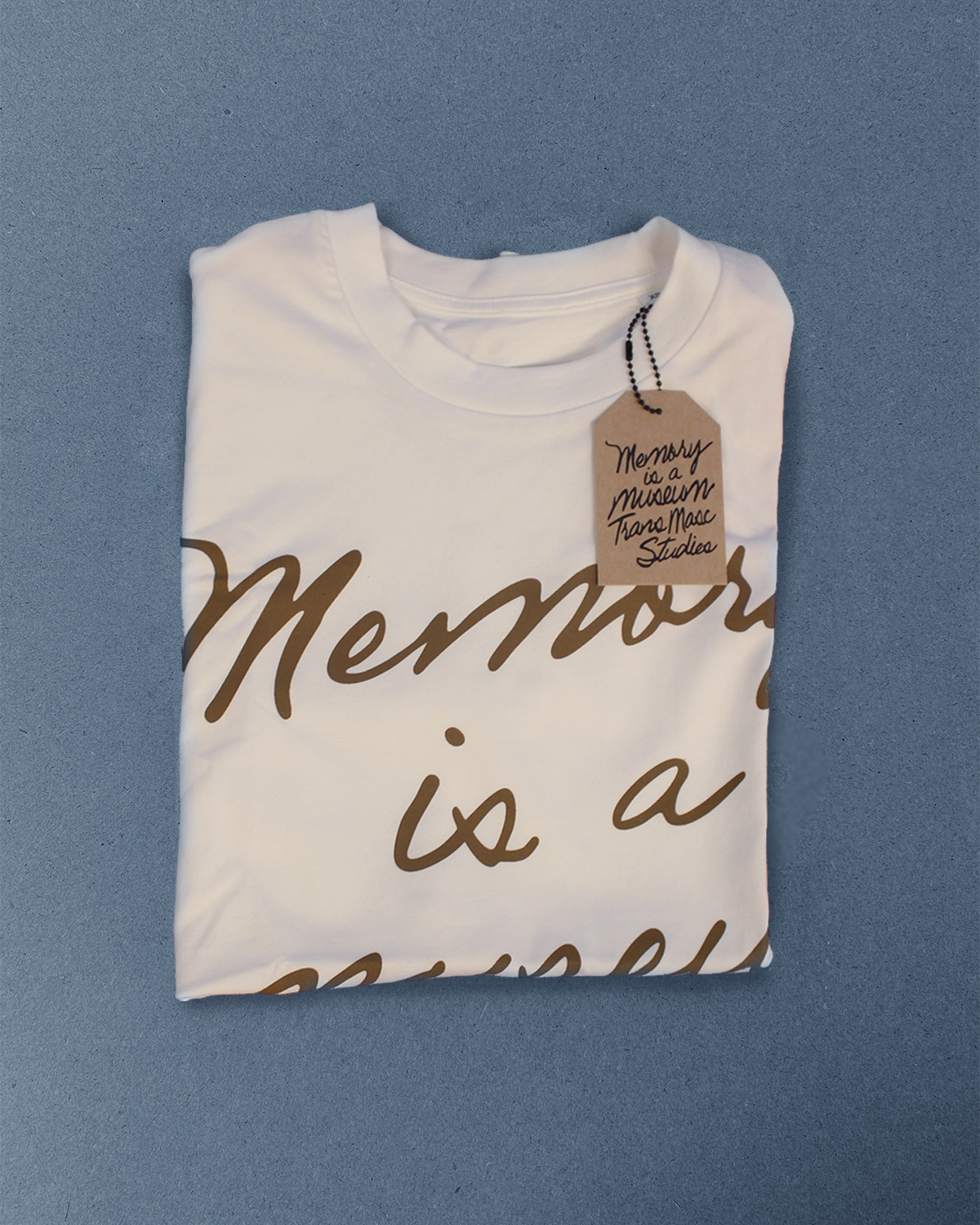 This 100% cotton, screen-printed T-shirt bears the name of Memory is a Museum, and is designed as a memento of the exhibition. The work is designed to be taken home — visitors become custodians; the museum expands; memory moves, lives, persists.